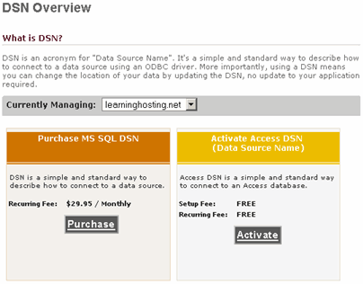 Depending on your hosting plan, there may or may not be a charge for Access DSN. Please refer to your plan details for further information. If there is a charge, you will be asked to confirm the charge after clicking on the Purchase button above. |