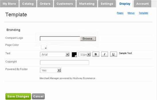 To change the store text font, select the appropriate font using the dropdown menu next to Text; to change the font color, click the color swatch; to change the font size, use the dropdown menu. Please note the "Sample Text" that will change instantly in response to your selections. |