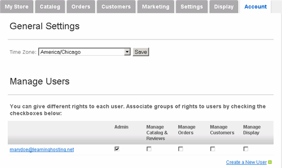 To set the permissions for a user, check one or more of the rights: Manage Catalog & Reviews, Manage Orders, Manage Customers and Manage Display. To give full permissions, check the Admin box. |