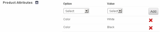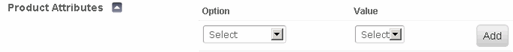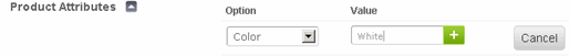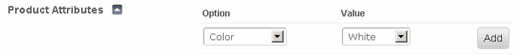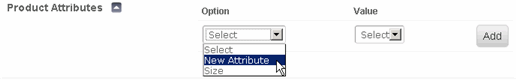 Before we continue, let's quickly define Product Attributes. Product Attributes are variations of a single product customers select that may or may not have varying pricing. For example, size and color are attributes, as are virtually any option you would like to offer for a particular product. If you have already created the desired attribute, then select it from the Option dropdown menu, along with its Value. Click Add. If you have not already created them, then you can create them here without having to go to the Attributes section of the admin interface. Since we are adding a t-shirt, let's create an attribute for color.