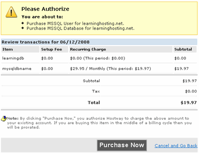 You now see the charge authorization page. Please note that there may or may not be a monthly charge depending on your Windows hosting plan. In our example, there are two itemized charges: one for the SQL user ($0.00) and one for the database itself ($19.97). Why $19.97 instead of the quoted rate of $29.95/month? This database was ordered on the 12th of the month and thus automatically received a pro-rated charge.