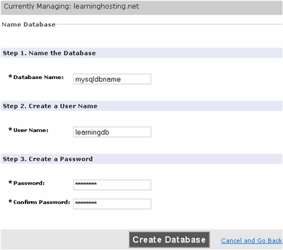 Note that database names must be between 2 and 14 characters long, and can only contain letters, numbers, and an underscore ("_"). Passwords must be at least 6 characters long and contain at least one digit or punctuation symbol. Click Create Database. |