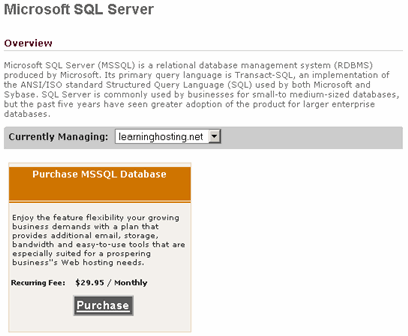 If you are on the Windows hosting platform, you may order a Microsoft SQL database in SiteControl. Depending on your plan, there may be an additional fee.