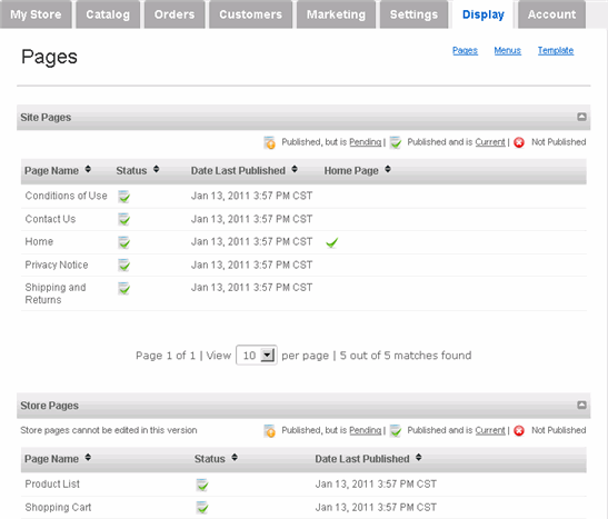 In addition to product and information pages that Merchant Manager builds for you in your store, you can create your own pages that incorporate into the store's navigation and appearance. For most owners, the pre-existing pages should suffice, in which case you only need to customize these pages to fit your store. Please note the difference between Site Pages and Store Pages, the latter of which is integral to the operation of your store and cannot be edited.