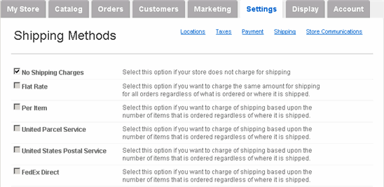 In order to deliver your products to your customers, Merchant Manager offers several shipping options. By default, the No Shipping Charges option is enabled.